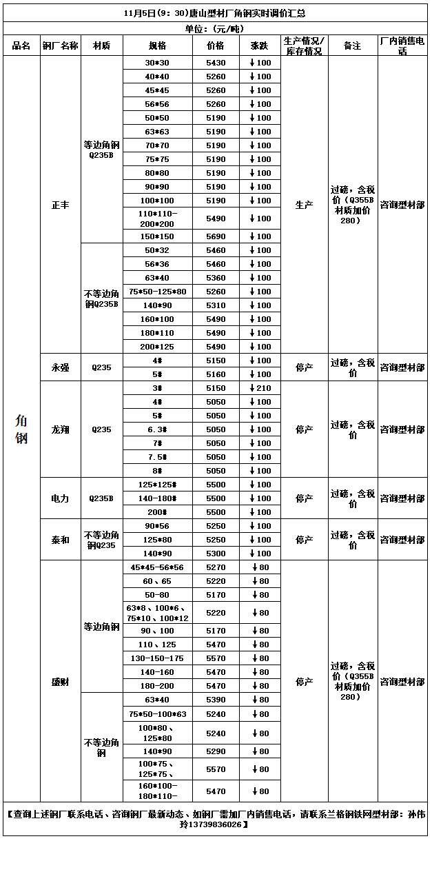 11月5日(9:30)唐山型材厂角钢实时调价汇总