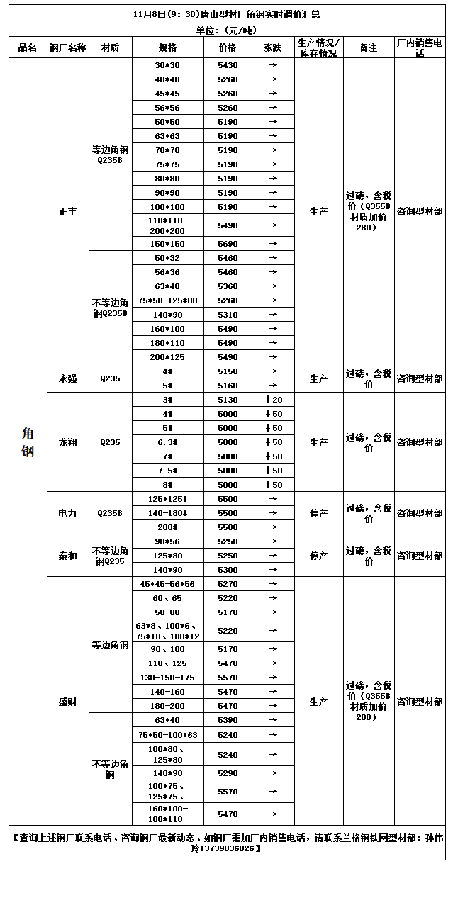 11月8日(9:30)唐山型材厂角钢实时调价汇总