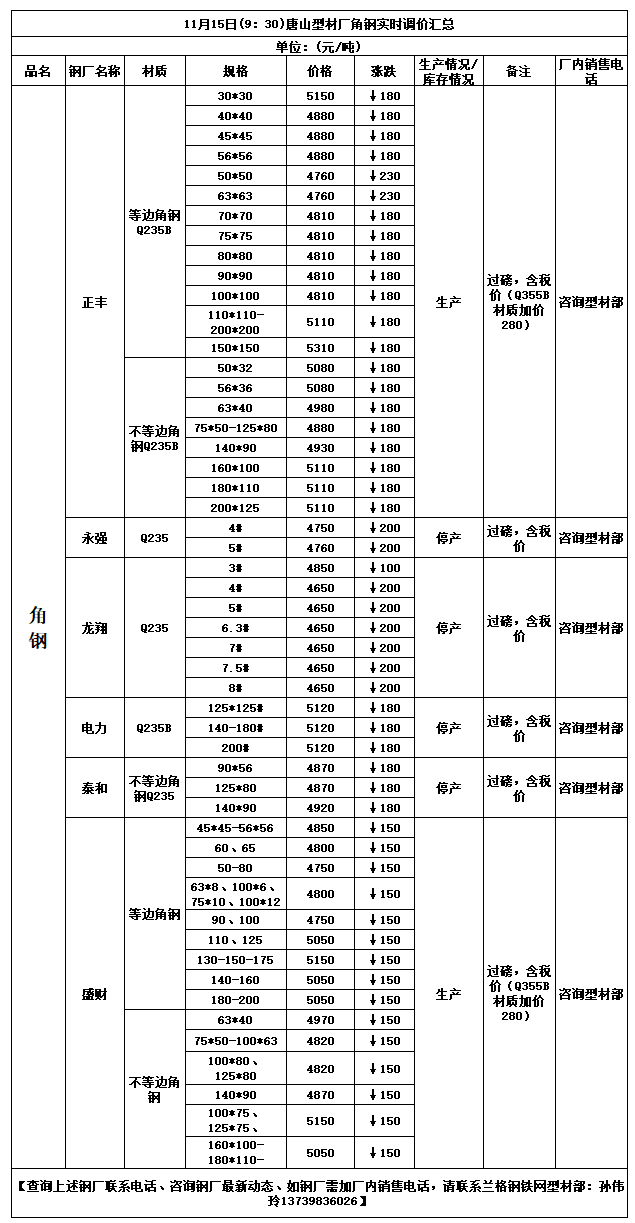 11月15日(9:30)唐山型材厂角钢实时调价汇总