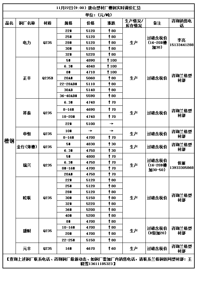 11月22日(9:00)唐山型材厂槽钢实时调价汇总