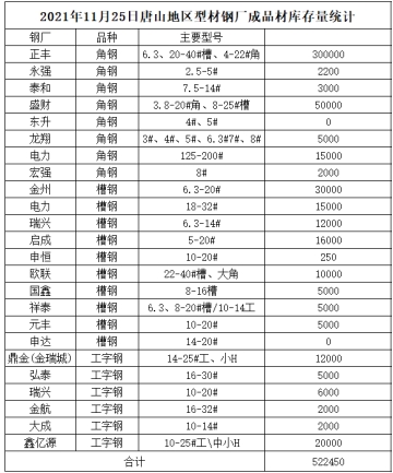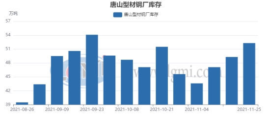 唐山型材库存调研:截止11月25日统计唐山24家钢厂成品材库存约52.25万吨,较上周(11月18日)增加3万吨,上升6.08%,据调查,受限产消息影响,本周大部分调坯轧钢厂连续生产4日,但整体成交一般,成品库存有所增长。