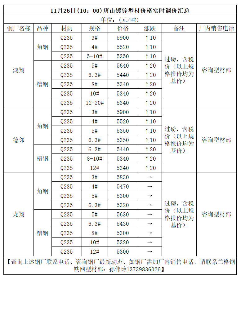 11月26日(9:30)唐山型材厂角钢实时调价汇总