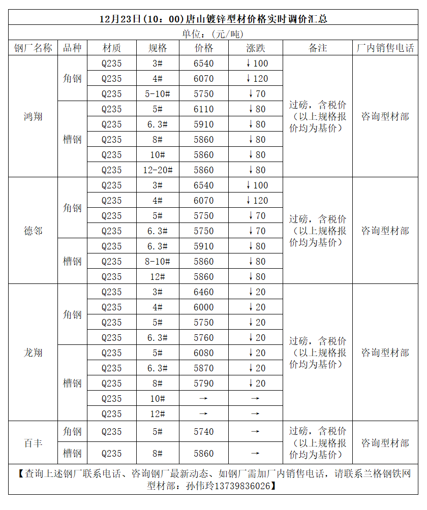 12月23日(9:30)唐山型材厂角钢实时调价汇总