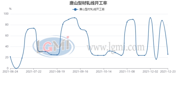 兰格调研:截止12月23日下午14:00统计唐山27家型钢厂42条生产线,停产或检修31条,开工率为26%,较本周一上升2%,较上周四下降62%,据调查,唐山地区仍执行重污染天气Ⅱ级应急响应,各企业响应环保政策,开工率处低位。