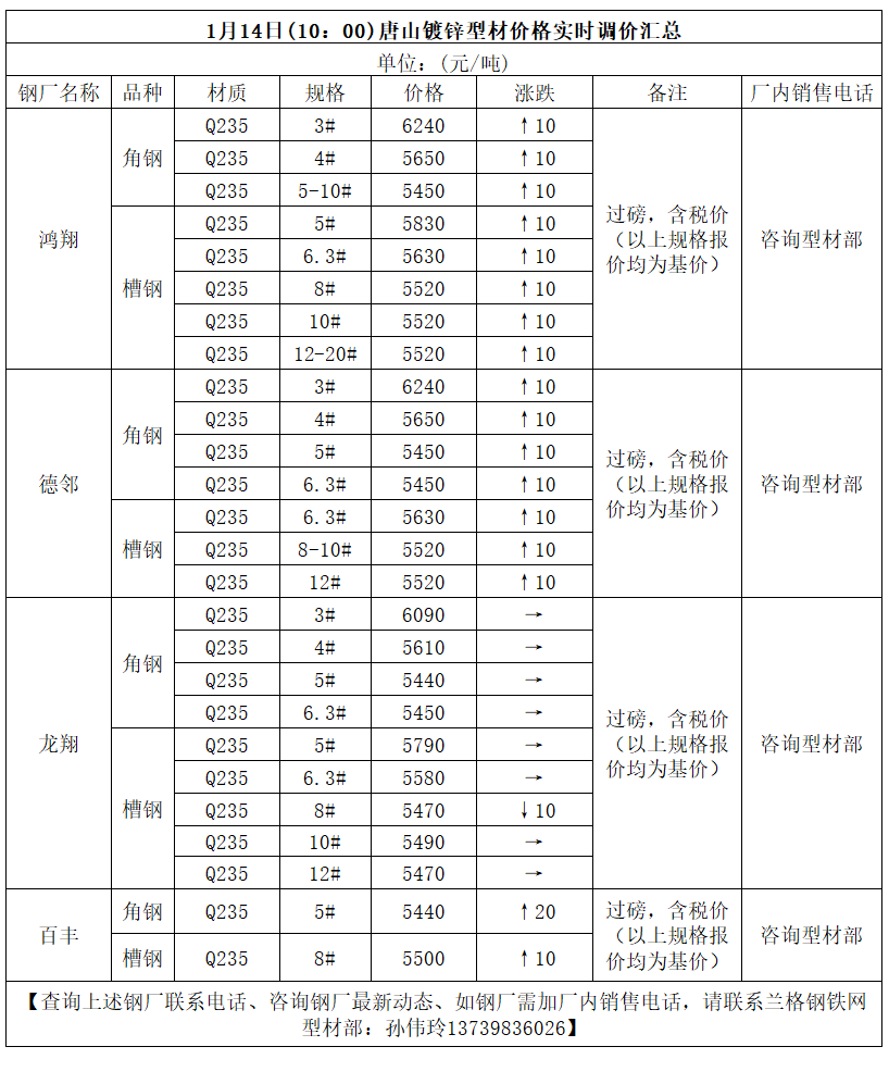 1月14日(9:30)唐山型材厂角钢实时调价汇总