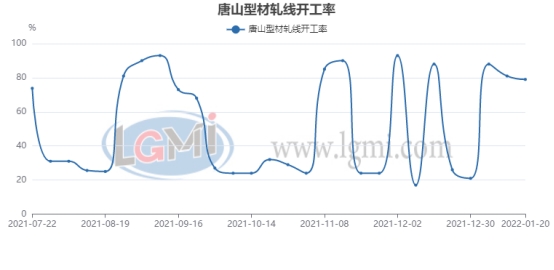 兰格调研:截止1月20日下午14:00统计唐山27家型钢厂43条生产线,停产或检修9条,开工率为79%,较本周一下降9%,较上周五下降2%,据调查,唐山部分企业已进入年底停产检修状态,开工率略有下降。