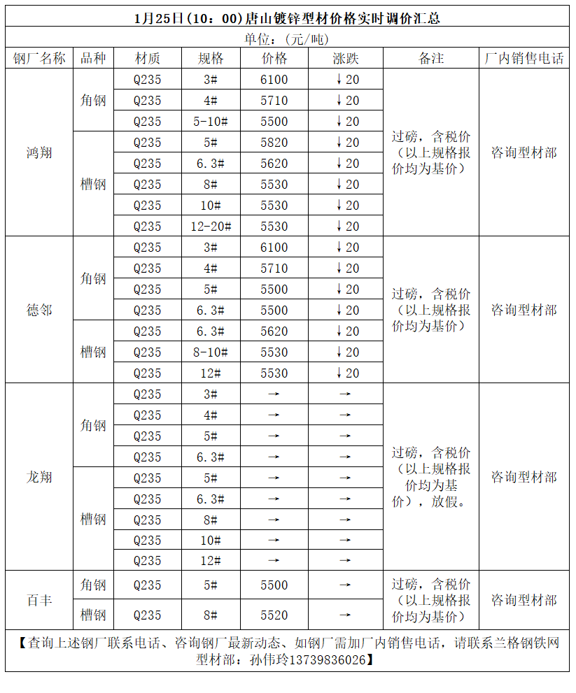1月25日(9:30)唐山型材厂角钢实时调价汇总