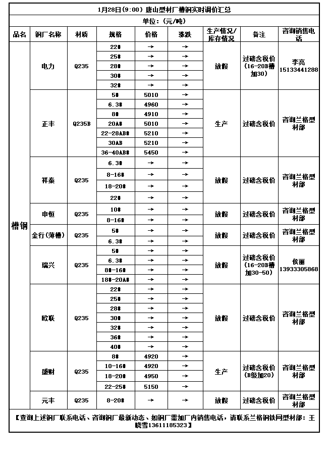 1月28日(9:00)唐山型材厂槽钢实时调价汇总