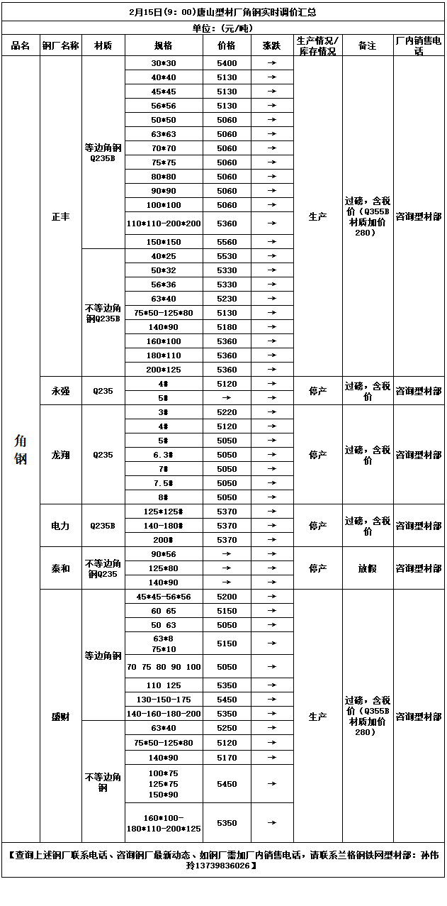 2月15日(9:00)唐山型材厂角钢实时调价汇总