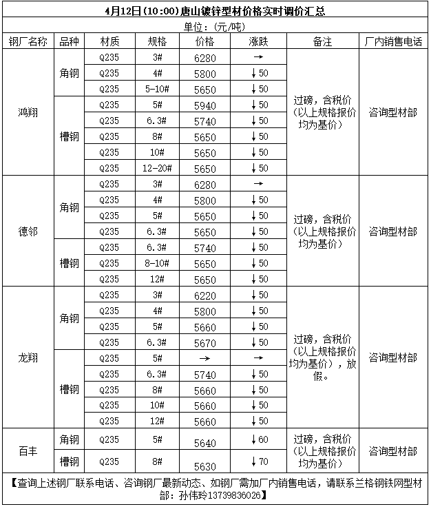 4月12日(10:00)唐山镀锌型材价格实时调价汇总