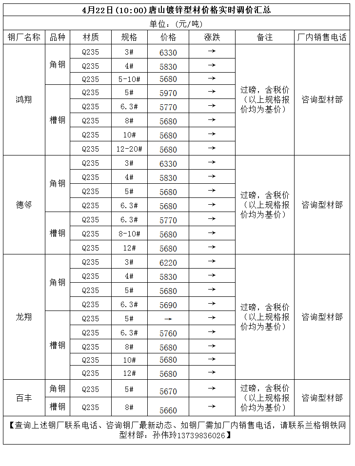 4月22日唐山龙翔角钢价格调价信息出厂价格