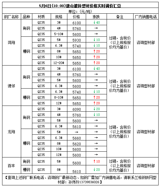 5月6日(9:00)唐山型材厂角钢实时调价汇总
