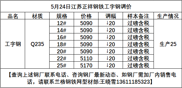 5月24日唐山玉田祥泰钢厂工字钢调价信息