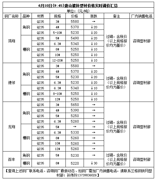 6月10日(9:45)唐山镀锌型材价格实时调价汇总