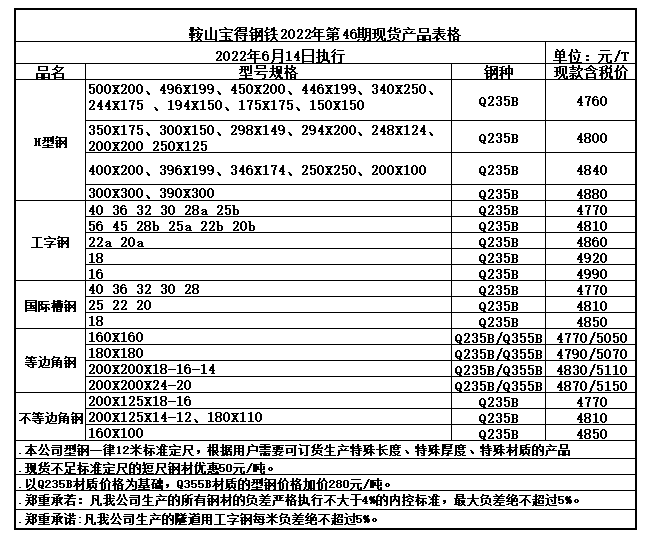 6月13日(9:30)唐山型材厂H型钢实时调价汇总