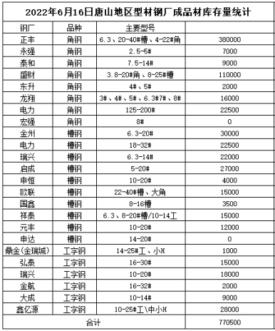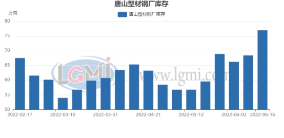 兰格调研:截止6月16日统计唐山24家钢厂成品材库存约为77.05万吨,较上周(6月9日)增加8.55万吨,上升12.48%,据调查,本周轧钢企业整体开工率处低值,其中部分厂家维持稳定生产,然下游用钢需求持续偏弱以致库存去化难度增大,故成材垒库压力显著。