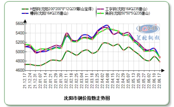 据兰格云商平台监测数据显示:今日沈阳市场16#工字钢价格为4880元,与上周同期降140元;16#槽钢价格为4880元,较上周同期降190元;5#角钢价格为4890元,与上周同期降110元;200×200H型钢价格为4790元,较上同期降110元。