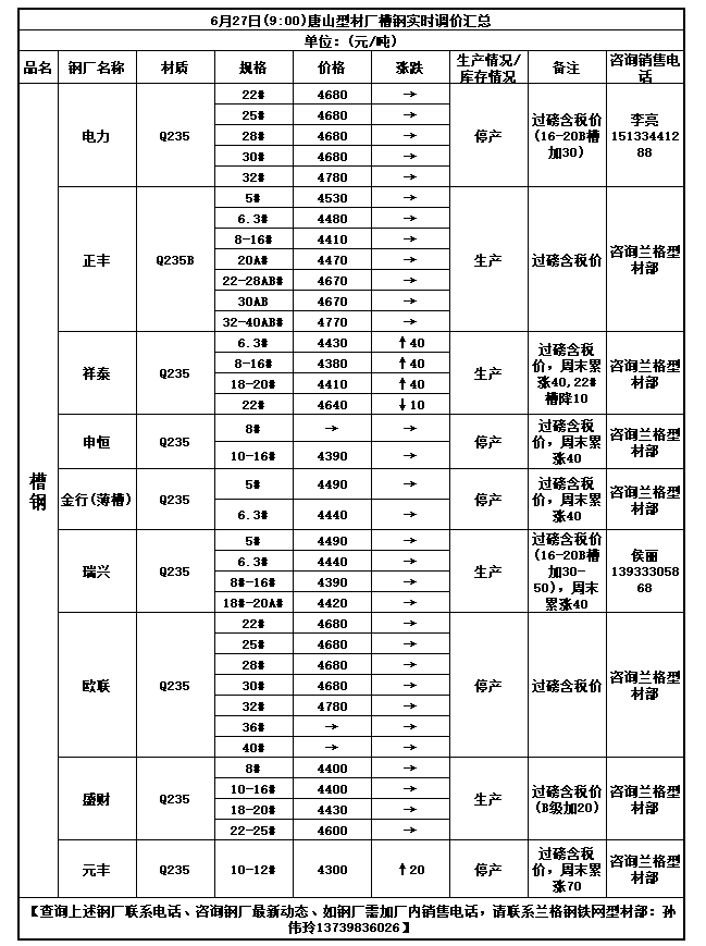 6月27日(9:00)唐山型材厂槽钢实时调价汇总