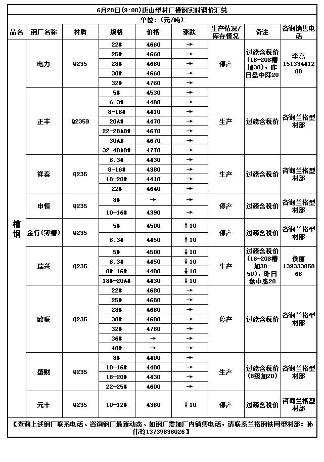 6月28日(9:00)唐山型材厂槽钢实时调价汇总