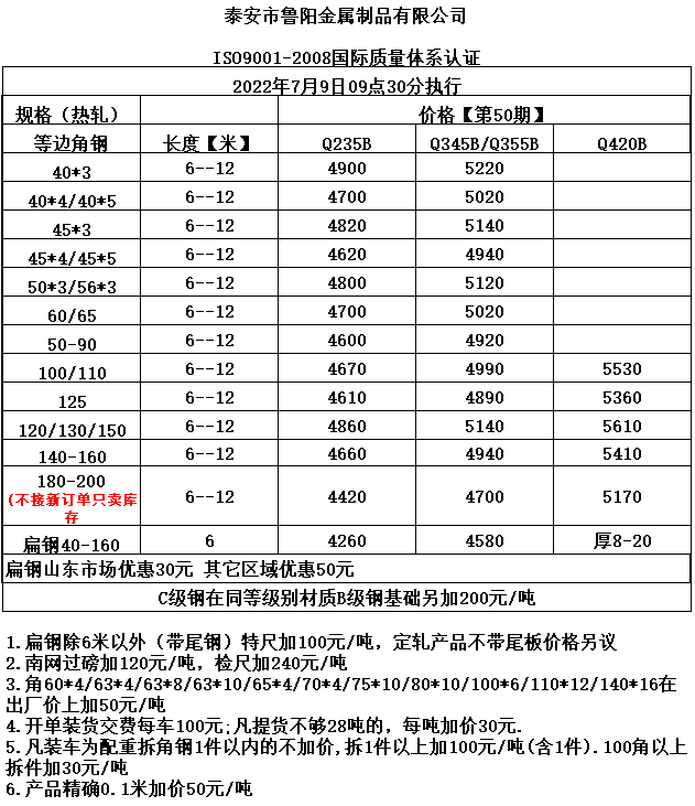 泰安市鲁阳型材第50期价格政策