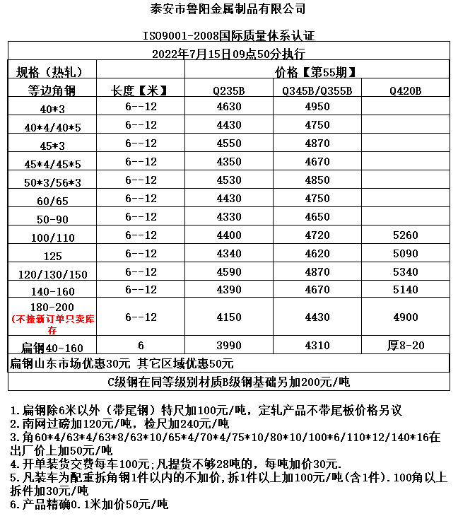 7月20日唐山龙翔角钢价格调价信息出厂价格