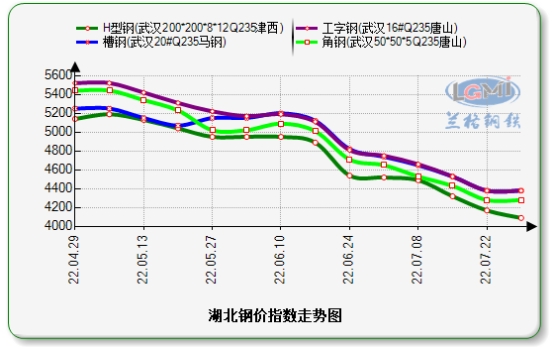据兰格云商平台监测数据显示:截至7月25日,湖北市场20#工字钢价格为4380元(吨价,下同),较上一工作日价格持稳;20#槽钢价格为4380元,较上一工作日价格持稳;5#角钢价格为4270元,较上一工作日价格持稳;200×200H型钢价格为4090元,较上一工作日价格下跌80元/吨。