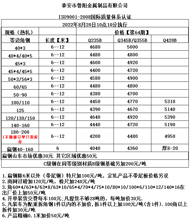 8月22日唐山龙翔角钢价格调价信息出厂价格