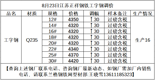 8月23日唐山玉田祥泰钢厂工字钢调价信息