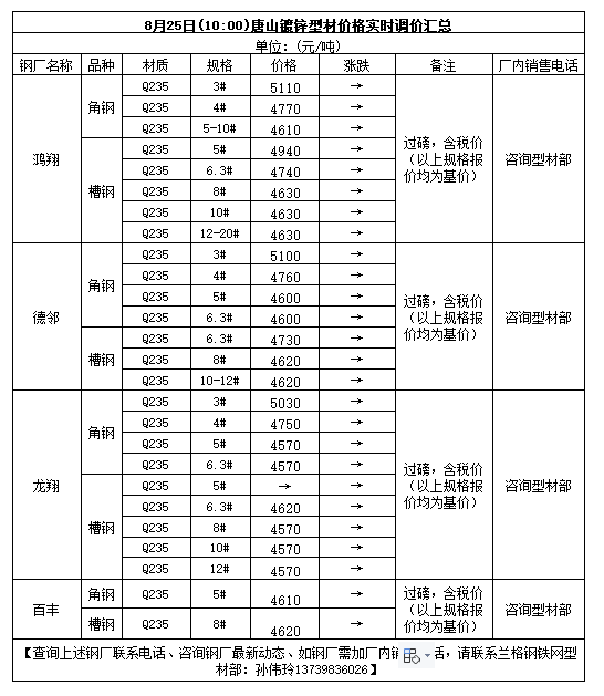 8月25日(10:00)唐山镀锌型材价格实时调价汇总