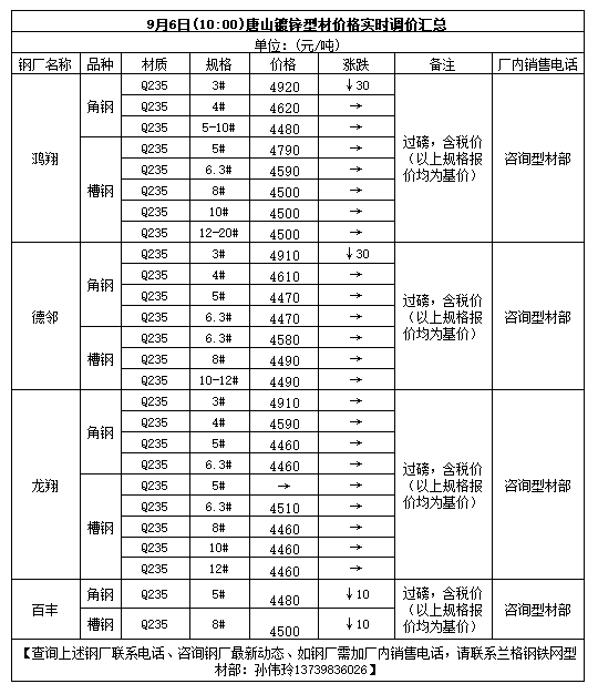 9月6日(10:00)唐山镀锌型材价格实时调价汇总