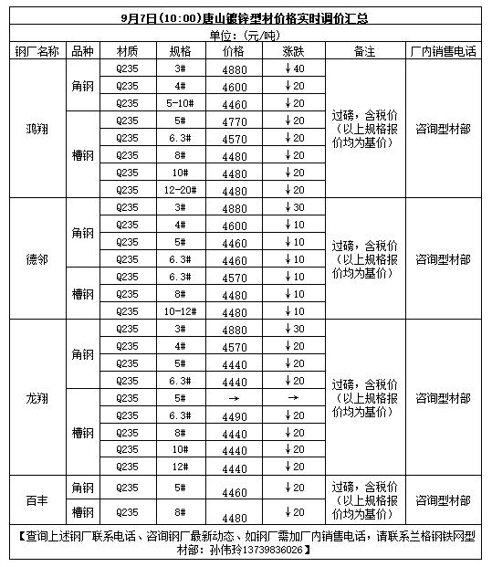 9月7日(10:00)唐山镀锌型材价格实时调价汇总