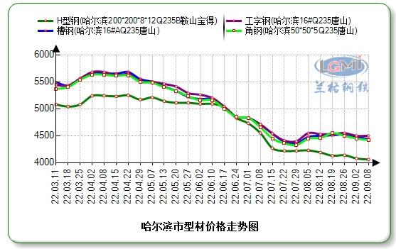据兰格云商平台监测数据显示:今日哈尔滨市场16#工字钢价格为4500元;16#A槽钢价格为4440元;5#角钢价格为4420元;200×200H型钢价格为4060元(国标检尺价格)。