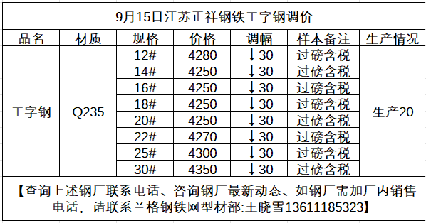 9月15日唐山玉田祥泰钢厂工字钢调价信息
