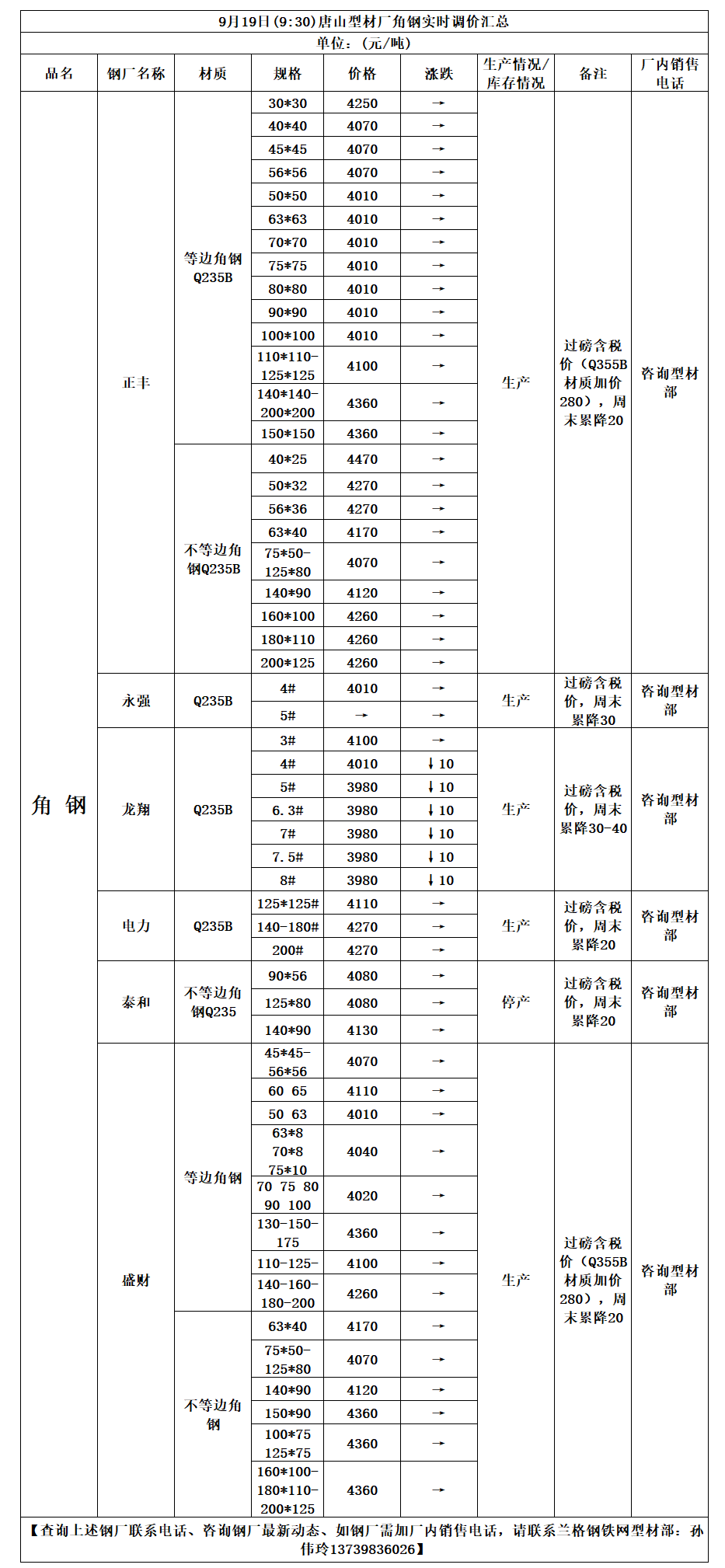 9月19日(9:30)唐山型材厂角钢实时调价汇总