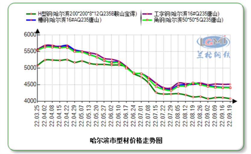 据兰格云商平台监测数据显示:今日哈尔滨市场16#工字钢价格为4510元;16#A槽钢价格为4420元;5#角钢价格为4410元;200×200H型钢价格为4080元(国标检尺价格)。