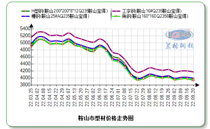 据兰格云商平台监测数据显示:今日鞍山市场16#工字钢价格为4170元;25#A槽钢价格为3990元;160*160角钢价格为3950元;200×200H型钢价格为3930元。