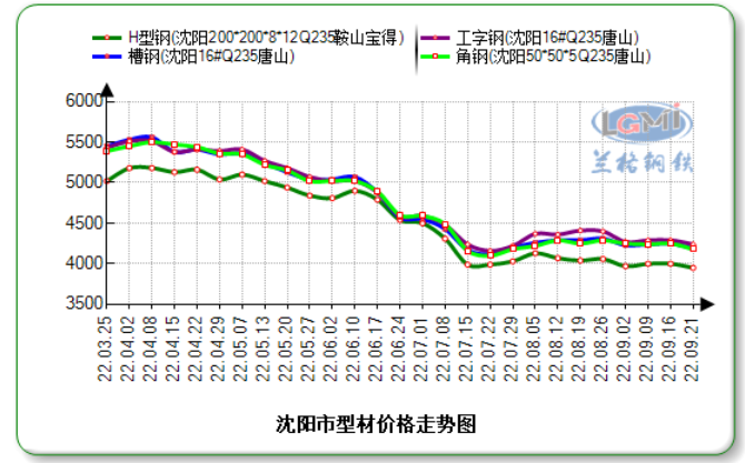 据兰格云商平台监测数据显示:今日沈阳市场16#工字钢价格为4240元;16#槽钢价格为4190元;5#角钢价格为4180元;200×200H型钢价格为3950元。