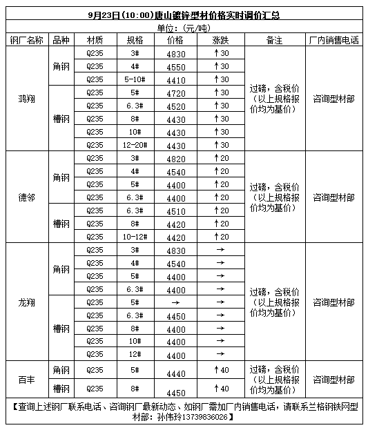 9月23日(09:30)唐山型材厂槽钢实时调价汇总