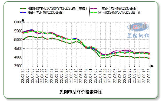 据兰格云商平台监测数据显示:今日沈阳市场16#工字钢价格为4240元,较上周同期降50;16#槽钢价格为4190元,较上周同期降60元;5#角钢价格为4180元,较上周同期降70元;200×200H型钢价格为3940元,较上周同期价格降60元。