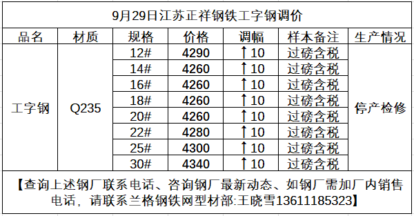 9月29日(9:30)唐山型材钢厂工字钢实时调价汇总