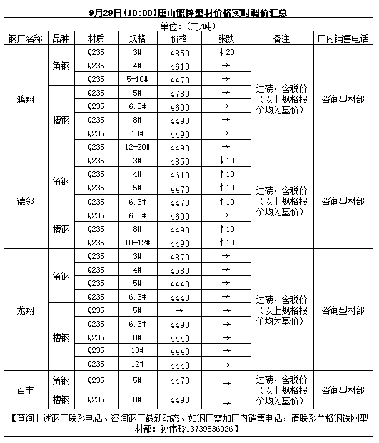 9月29日(9:30)唐山型材厂角钢实时调价汇总