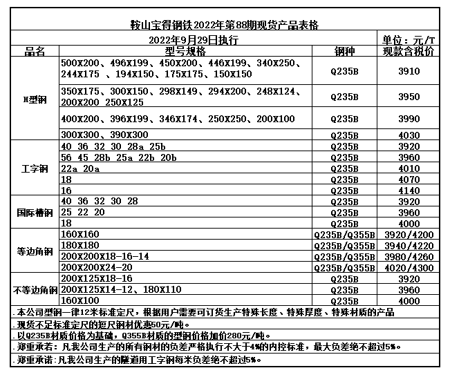 9月29日山西晋南钢铁型钢挂牌价格稳