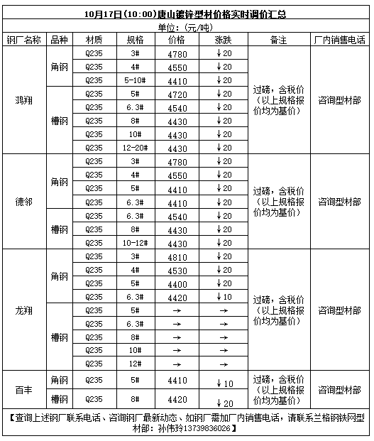 10月17日唐山龙翔角钢价格调价信息出厂价格