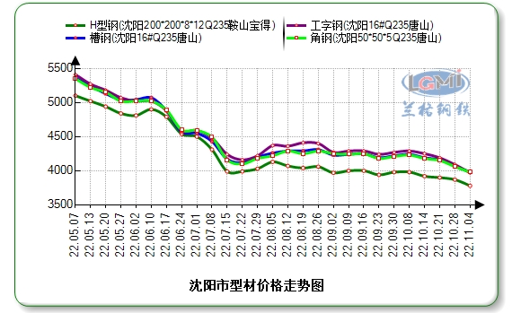 据兰格云商平台监测数据显示:今日沈阳市场16#工字钢价格为3970元,较上周同期统计降120元;16#槽钢价格为3980元,较上周同期统计降90元;5#角钢价格为3980元,较上周同期降80元;200×200H型钢价格为3780元,较上周同期统计降120元。