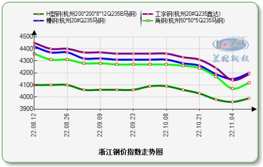 据兰格云商平台监测数据显示:截至11月10日,浙江市场20#工字钢价格为4190元(吨价,下同),较上一工作日价格持稳;20#槽钢价格为4200元,较上一工作日价格持稳;5#角钢价格为4120元,较上一工作日价格持稳;200×200H型钢价格为3990元,较上一工作日价格持稳。