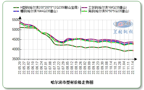 据兰格云商平台监测数据显示:今日哈尔滨市场16#工字钢价格为4370元;16#A槽钢价格为4300元;5#角钢价格为4270元;200×200H型钢价格为3940元(国标检尺价格)。