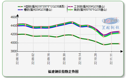 据兰格云商平台监测数据显示:截至11月15日,福建市场20#工字钢价格为4270元(吨价,下同),较上一工作日价格持稳;20#槽钢价格为4240元,较上一工作日价格持稳;5#角钢价格为4230元,较上一工作日价格持稳;200×200H型钢价格为3980元,较上一工作日价格持稳。