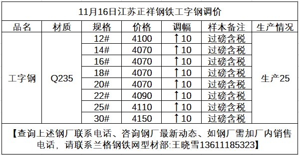 11月16日江苏正祥工字钢价格涨10