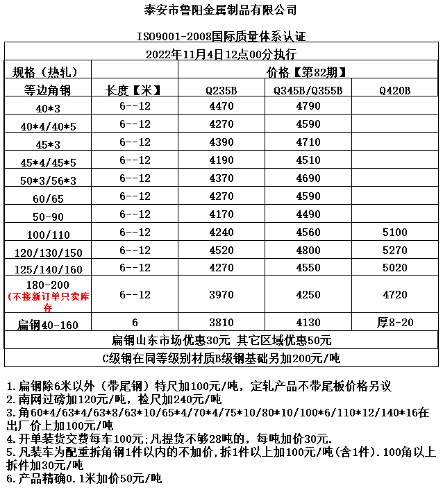 11月16日马钢对型钢产品销售指导价统一上涨30