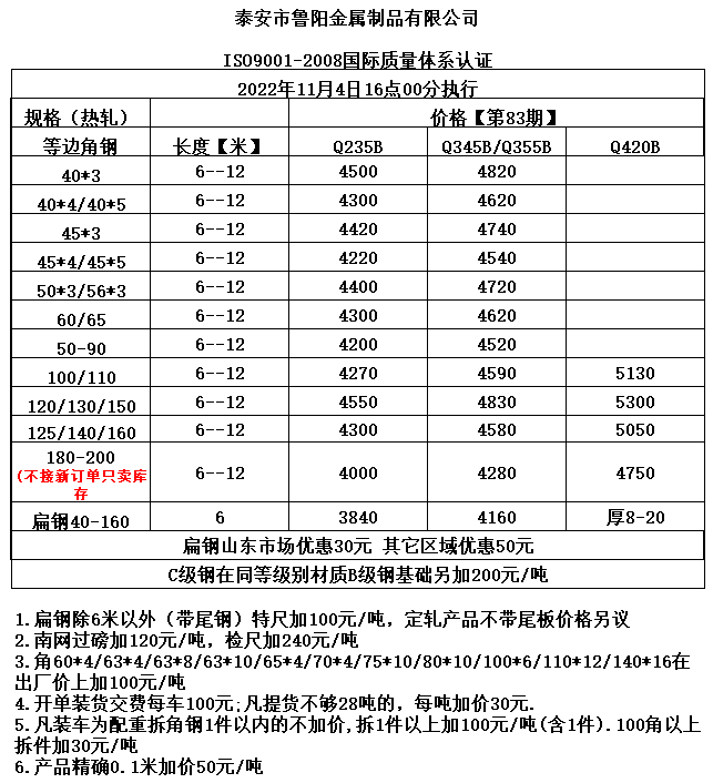 11月16日马钢对型钢产品销售指导价统一上涨30